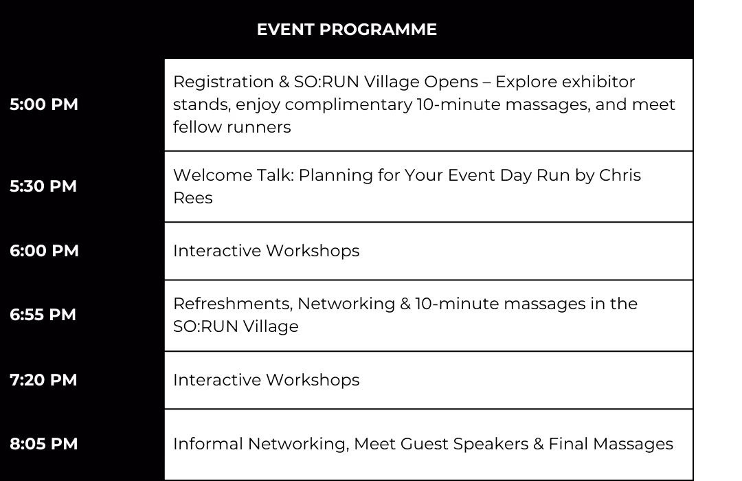- Guest Talks: Gain race-day insights from event organisers and nutrition specialists.